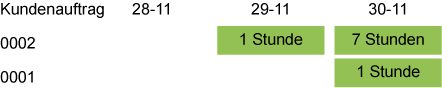 Für den Auftrag 0002 werden am 30. November 7 Stunden eingeplant, da an diesem Tag keine ausreichende Kapazität für 8 Stunden verfügbar ist. Am 29. November wird die restliche Stunde eingeplant.