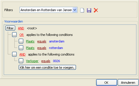 Moeten de gegevens aan alle voorwaarden voldoen, kies dan voor AND. Moeten de gegevens aan ten minste één voorwaarde voldoen, kies dan voor OR, bijvoorbeeld als u klanten uit Nijmegen of Rotterdam zoekt: 'Plaats equals Nijmegen' OR 'Plaats equals Rotterdam'.