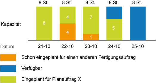 Für Arbeitsgang A beträgt die Planzeit 24 Stunden und die Kapazität 8 Stunden pro Tag. Wenn der 21. Oktober das Startdatum ist, kann am ersten Tag 8 Stunden gearbeitet werden, am zweiten Tag 4 Stunden (da 4 Stunden bereits besetzt sind), am dritten Tag 7 Stunden (da 1 Stunde bereits besetzt ist) und am vierten Tag die letzten 5 Stunden. Der 24. Oktober wird dann auch das Endedatum.