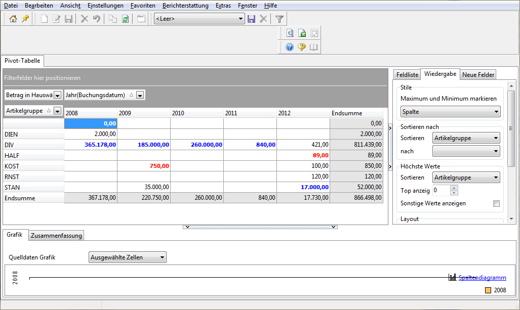 Unterteilte Daten können im Fenster ein- oder ausgeklappt angezeigt werden. Die Artikelgruppe DIV kann zum Beispiel in unterschiedliche Artikel unterteilt sein. Wenn Sie mit der rechten Maustaste auf die Reihen- oder Spaltenfelder klicken, können Sie ein- oder ausklappen wählen. Sie können das ggf. für Reihen und Spalten gleichzeitig durchführen.