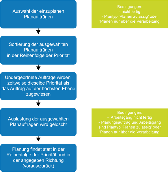 Wenn Sie die Verarbeitung Durchlaufterminierung ausführen verwenden, trifft Isah in erster Instanz eine Auswahl der Plan-/Fertigungsaufträge, die Ihren Kriterien entsprechen. Erst danach werden die Arbeitsgänge geplant. Die damit verbundenen, grundlegenden Schritte gestalten sich folgendermaßen: