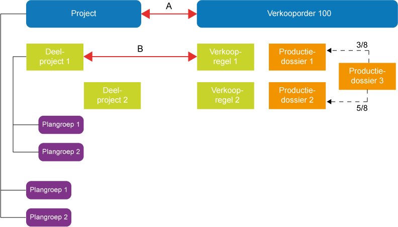 Een projectregel is gekoppeld aan verkooporder 100 en bevat twee plangroepen waarmee de kosten worden ingeschat; het onderliggende deelproject is gekoppeld aan verkoopregel 1 en bevat ook twee plangroepen waarmee de kosten worden ingeschat.