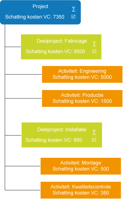 Op het tabblad ziet u in de kolom Schatting enkele velden met het symbool S erachter. Een schattingsveld kunt u niet zelf invullen als u het kenmerk S achter het veld heeft geactiveerd. De velden waarachter het kenmerk S actief is, berekent Isah namelijk door de inhoud van hetzelfde veld in de direct onderliggende projectregels (deelprojecten, acties en dergelijke) bij elkaar op te tellen.