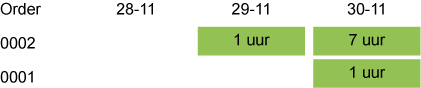 Voor order 0002 wordt 7 uur ingepland op 30-11, omdat er op die dag niet voldoende capaciteit beschikbaar is voor 8 uur. Op 29-11 wordt het resterende uur ingepland.