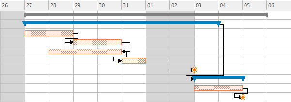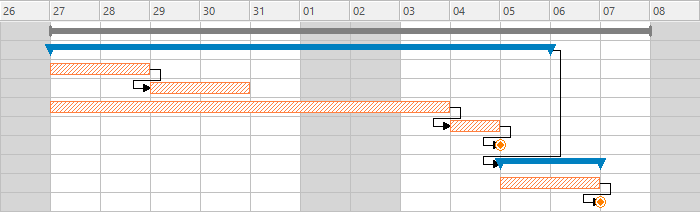 Voor Isah is de eind-eindrelatie belangrijker dan de startdatum van het project. U zult dus dezelfde uitkomst krijgen als in de afbeelding hierboven. Wilt u hiervan afwijken, dan kunt u er bijvoorbeeld voor kiezen de eind-eindrelatie te verbreken. De bewerking die het probleem oplevert zal dan starten op de vroegst mogelijke datum: